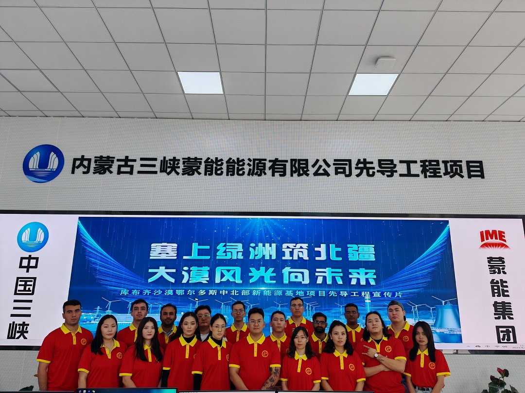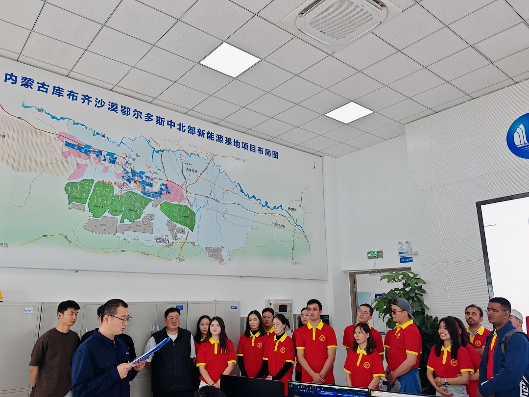 活动当天上午,学生们前往内蒙古三峡蒙能能源有限公司。公司位于内蒙古自治区鄂尔多斯达拉特旗,是库布齐沙漠鄂尔多斯中北部新能源基地项目的实施主体,以打造“绿色能源+生态治理”一体化基地为核心目标,建设集发电、治沙、种植于一体的立体绿色生态系统,保障沙漠地区新能源设备可靠发电的同时提升基地生态效益,助力地方能源绿色低碳转型,支撑国家北方生态安全屏障建设。进入项目实地,中外学生聚精会神地听取解说员讲解,深刻感知到内蒙古三峡蒙能能源有限公司的庞大规模、科技创新精神和新能源开发动力。苏丹留学生百川说,内蒙古很好地融合了自然美景和能源发展,践行了“绿水青山就是金山银山”的理念,通过参观当地的绿色能源项目,我了解到这些绿色能源的工作原理和应用情况,认识到绿色能源的重要性。
