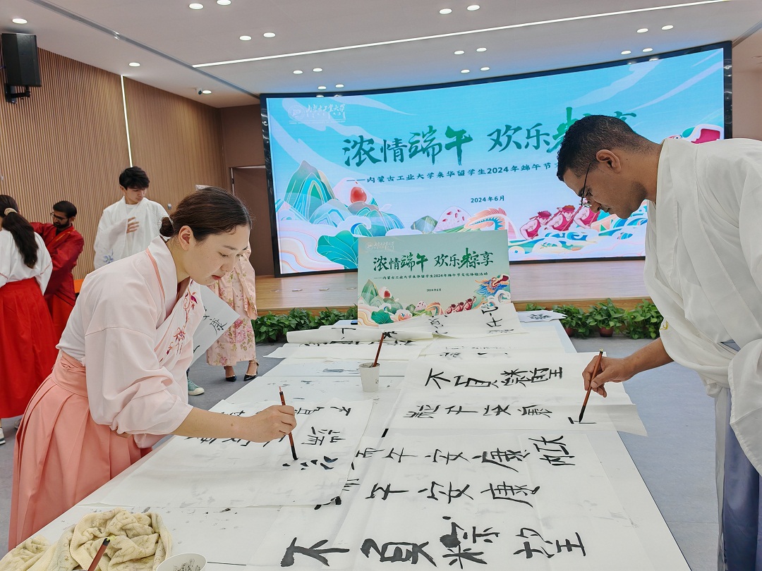 留学生们身着中国传统服饰,在太阳集团tyc9728报告厅,观看了介绍端午节的来历和端午节传统习俗的主题视频,深入了解端午节文化。 随后,受邀的学校后勤食堂师傅现场为留学生演示了传统的裹粽手艺,留学生们迫不及待地动手学习起如何包粽子。折粽叶,舀糯米,加红枣,缠粽线,在食堂师傅们的耐心指导下,留学生们包得也越发得心应手。虽然包出来的粽子有的是三个角的,有的是四个角,形状各异,但是大家体会到了极大的乐趣。最后,留学生们拿起毛笔,学习中国书法。大家热情高涨,纷纷书写下“端午安康”等祝福语,体验中国书法艺术之美。