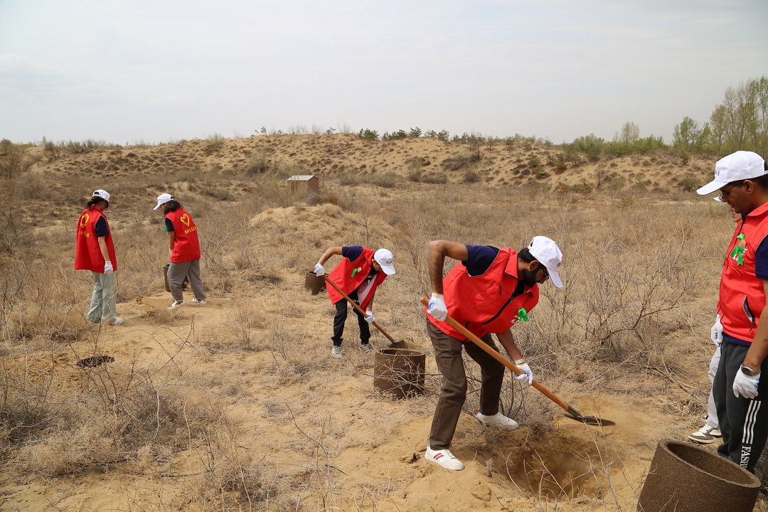 活动现场,气氛热烈而欢快。大家一边劳动,一边交流,一起栽下一株株象征着中外青年友好的小树苗,树苗在春风里焕发出勃勃生机,为春天里的恩格贝增添了一道靓丽风景。来自我校的苏丹留学生百川是第二次踏上这片沙漠,在接受采访时说:“看到自己植的树非常高兴,这次带领同学来植树,希望能为环境保护贡献一份自己的力量。”