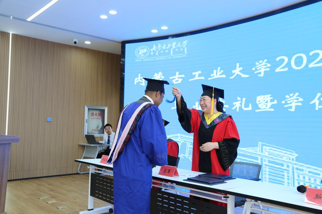 教师代表胡云波副教授发言,她向圆满完成学业的留学生表示祝贺,回顾了与留学生们相处的温馨点滴,毕业生充分发挥自己的语言特长和专业优势,积极应对各种挑战与机遇,创造属于自己的美好生活。毕业生代表、蒙古国留学生乌云达丽发言。她用流利的汉语对母校的谆谆教诲和老师们的悉心关怀表达了感激之情,并表示回国后会投身自己国家的发展与建设,努力为加强两国友好关系做出自己的贡献。在校生代表,2021级本科生毕力格图向毕业生致寄语,首先对师哥师姐们顺利毕业表示祝贺,希望师哥师姐们经常来母校看望,时刻关注母校的发展。