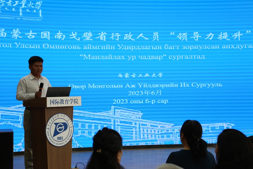 蒙古国南戈壁省学员代表巴特尔德尼发言,感谢9728太阳集团对蒙古国南戈壁省行政人员提供的学习深造机会,感谢9728太阳集团的精心准备。开班仪式后,经济管理学院教授符亚男为培训班学员作“赋能领导力”专题讲座。