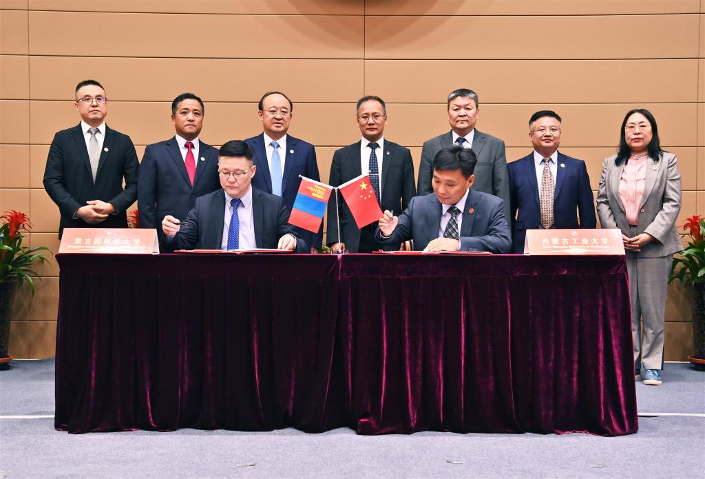 李占峰、特·那木农为国际成果转化与技术转移中心、跨境智慧物流与智能装备联合实验室揭牌;宝音、德·朝鲁门巴特尔签署两校共建国际成果转化与技术转移中心合作协议;郭洪飞、德·朝鲁门巴特尔签署两校共建跨境智慧物流与智能装备联合实验室协议。