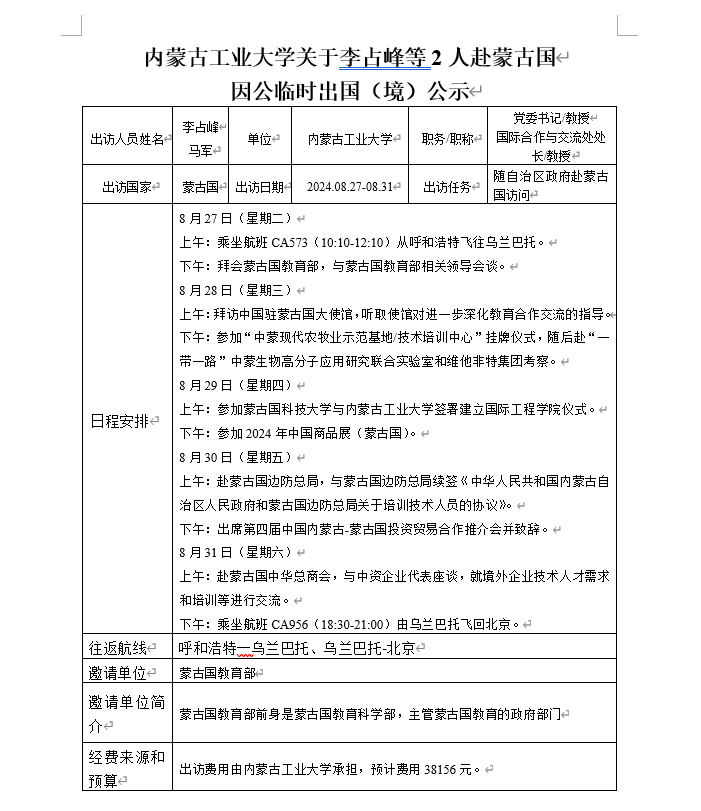 9728太阳集团关于李占峰等2人赴蒙古国因公临时出国(境)公示