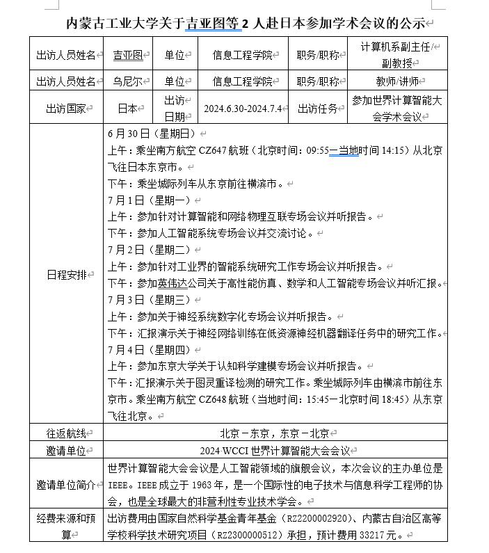 9728太阳集团关于吉亚图等2人赴日本参加学术会议的公示