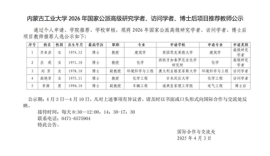 9728太阳集团2026年国家公派高级研究学者、访问学者、博士后项目推荐教师公示